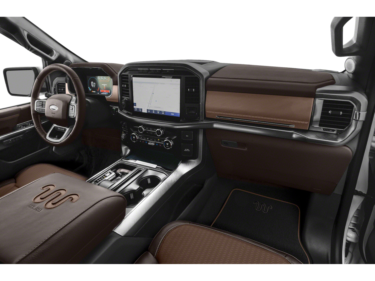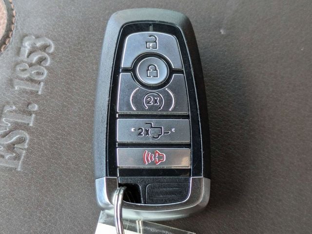THIS VEHICLE INCLUDES THE FOLLOWING FEATURES AND OPTIONS: Bed Utility Package (BoxLink, LED Box Lighting, Power Tailgate, and Tailgate Step w/Tailgate Work Surface), Equipment Group 601A High (Power-Deployable Running Boards and Radio: B&O Unleashed Sound System by Bang & Olufsen), 4WD, 20 Machined-Aluminum Wheels, 3.31 Axle Ratio, 4-Wheel Disc Brakes, 8 Speakers, ABS brakes, Adjustable pedals, Air Conditioning, Alloy wheels, AM/FM radio: SiriusXM with 360L, Auto High-beam Headlights, Auto Start-Stop Removal (DISC), Auto tilt-away steering wheel, Auto-dimming door mirrors, Auto-dimming Rear-View mirror, Automatic temperature control, Brake assist, Class IV Trailer Hitch Receiver, Compass, Delay-off headlights, Driver door bin, Driver vanity mirror, Dual front impact airbags, Dual front side impact airbags, Electronic Stability Control, Emergency communication system: SYNC 4 911 Assist, Exterior Parking Camera Rear, Front anti-roll bar, Front Bucket Seats, Front Center Armrest, Front dual zone A/C, Front fog lights, Front reading lights, Front wheel independent suspension, Fully automatic headlights, Garage door transmitter, Genuine wood console insert, Genuine wood dashboard insert, Genuine wood door panel insert, Heated door mirrors, Heated front seats, Heated rear seats, Heated steering wheel, Illuminated entry, Inclination/Intrusion Sensor Removal, Integrated Trailer Brake Controller, King Ranch Leather Bucket Seats, LED Sideview Mirror Spotlights, Low tire pressure warning, Memory seat, Multicontour Seats w/Active Motion Removal, Occupant sensing airbag, Outside temperature display, Overhead airbag, Overhead console, Panic alarm, Passenger door bin, Passenger vanity mirror, Pedal memory, Power door mirrors, Power driver seat, Power passenger seat, Power steering, Power windows, Radio data system, Radio: B&O Sound System by Bang & Olufsen, Rain sensing wipers, Rear reading lights, Rear seat center armrest, Rear step bumper, Rear window defroster, Remote keyless entry, Security system, Speed control, Speed-sensing steering, Split folding rear seat, Steering Wheel Heat Removal (DISC), Steering wheel memory, Steering wheel mounted audio controls, SYNC 4 w/Enhanced Voice Recognition, Tachometer, Telescoping steering wheel, Tilt steering wheel, Traction control, Trip computer, Turn signal indicator mirrors, Variably intermittent wipers, Ventilated front seats, and Voltmeter.