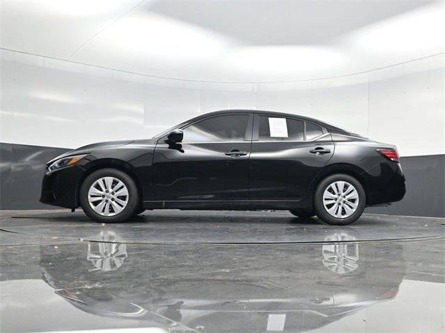 Black 2025 Nissan Sentra S FWD CVT with Xtronic 2.0L I4 DOHC CVT with Xtronic, Charcoal Cloth, Auto High-beam Headlights, Blind Spot Warning, Brake assist, Bumpers: body-color, Cloth Seat Trim, Driver door bin, Driver vanity mirror, Front reading lights, Illuminated entry, NissanConnect featuring Apple CarPlay and Android Auto, Power door mirrors, Rear Parking Sensors, Remote keyless entry.